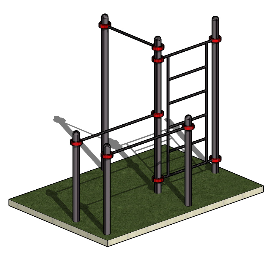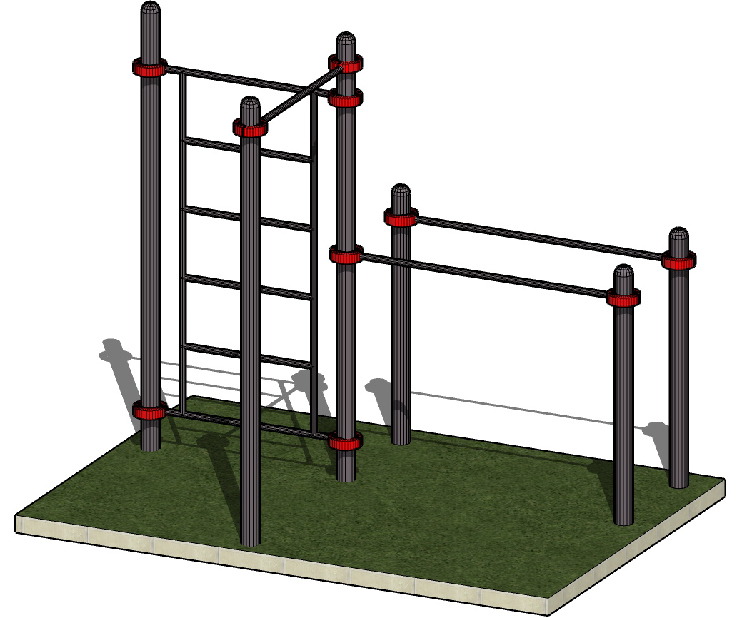 К опорным столбам высотой 2600мм в количестве 3 единиц крепится на высоте от уровня основания: 2450 мм – перекладина турника, 2300 мм- шведская стенка. Ширина шведской стенки составляет 1200 мм. Высота шведской стенки 2070 мм. Два столба высотой 1500 мм от уровня основания составляют опору для фиксации горизонтальных перекладин брусьев. Все составляющие комплекса крепятся между собой при помощи хомутов. Общая длина комплекса составляет не более 2950 м.